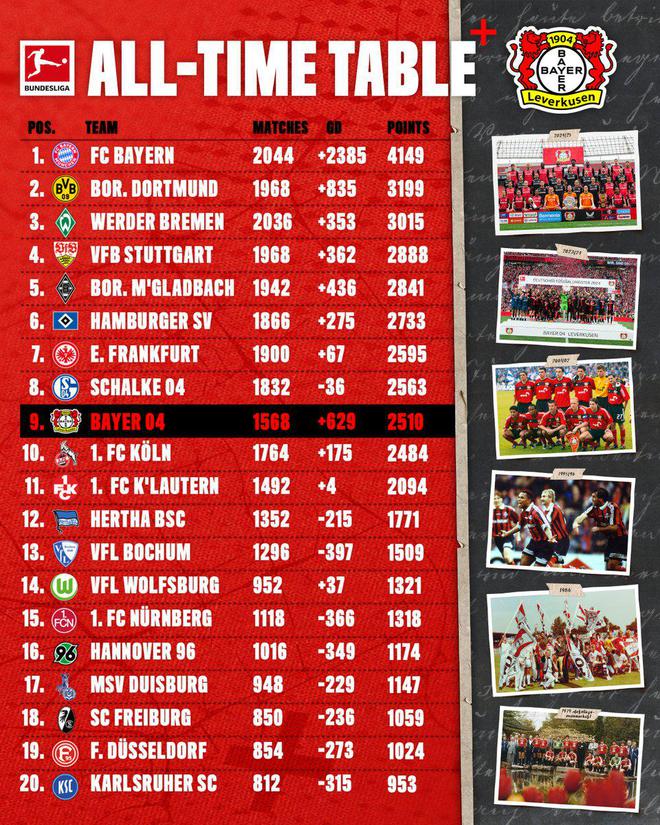 德甲历史总积分榜:拜仁居首,多特、不莱梅分列二三